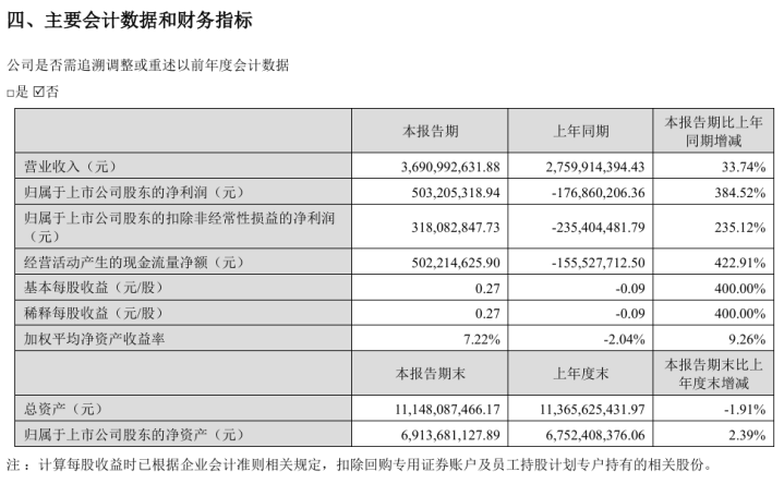 归属于上市公司股东的净利润5.03亿元,归属于上市公司股东的扣除非经常性损益后的净利润3.18亿元,较上年同期扭亏为盈;
